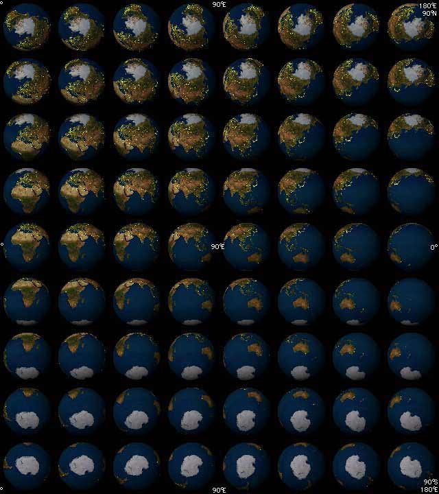 The thumbnails below are arranged by longitude, left to right from 0 degrees to 180 degrees East, in increments of 22.5 degrees rotation. Latitude is arranged top to bottom from 90 degrees North to 90 degrees South, in increments of 22.5 degrees. Click here to return to 180 degrees West longitude to 0 degrees view or scroll back up this page. View sample image.