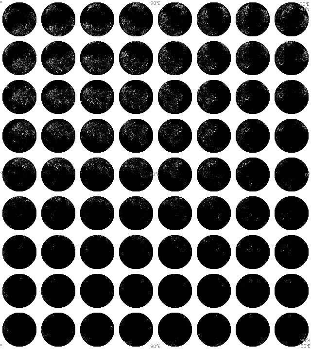 The thumbnails below are arranged by longitude, left to right from 0 degrees to 180 degrees East, in increments of 22.5 degrees rotation. Latitude is arranged top to bottom from 90 degrees North to 90 degrees South, in increments of 22.5 degrees. Click here to return to 180 degrees West longitude to 0 degrees view or scroll back up this page. View sample image.