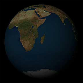 NIGHT-TIME* The Earth at night without clouds, based on images from the US Air Force DMSP weather satellite. Click either image above to view full size.